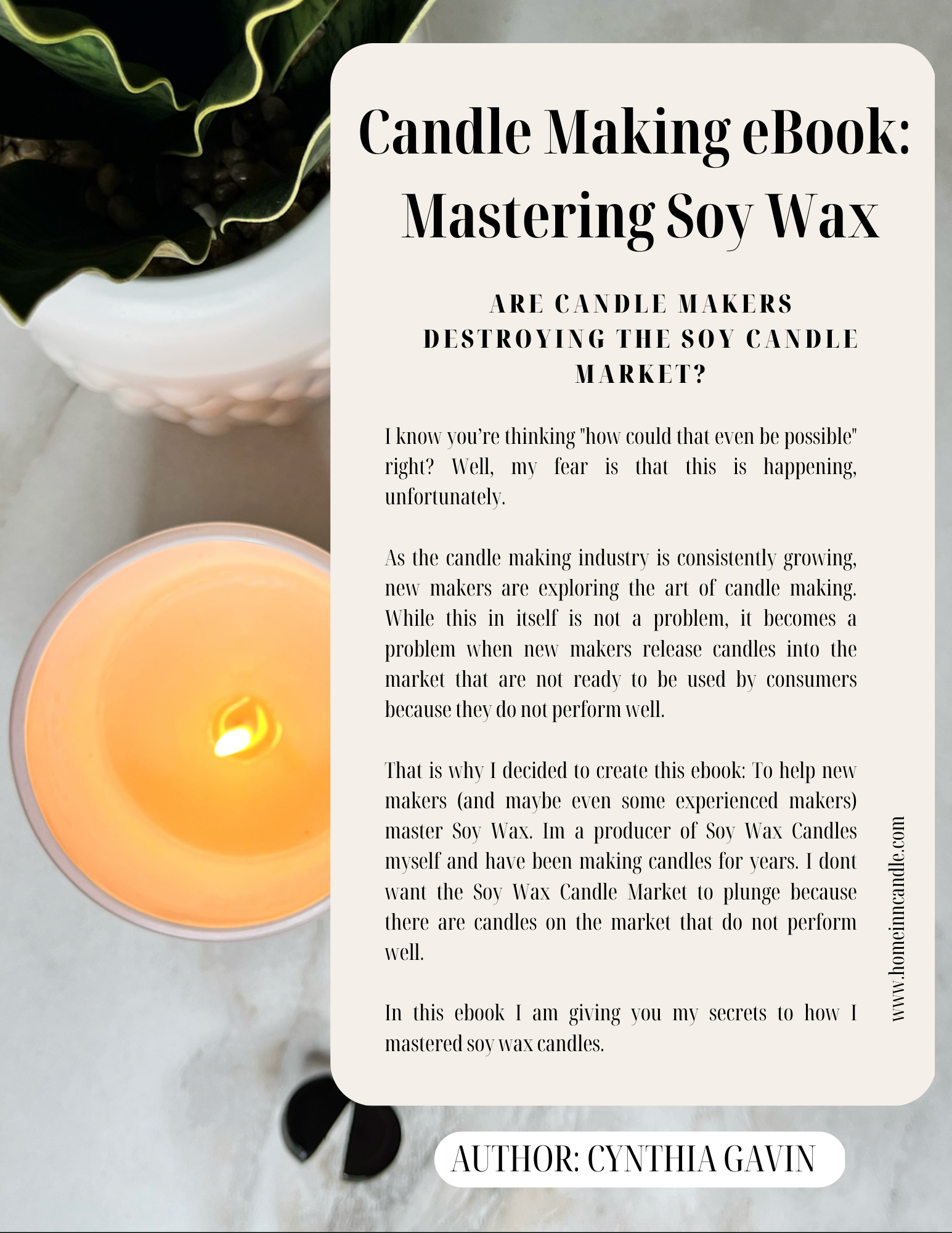 That is why I decided to create this ebook: To help new makers (and maybe even some experienced makers) master Soy Wax. Im a producer of Soy Wax Candles myself and have been making candles for years. I don't want the Soy Wax Candle Market to plunge because there are candles on the market that do not perform well.