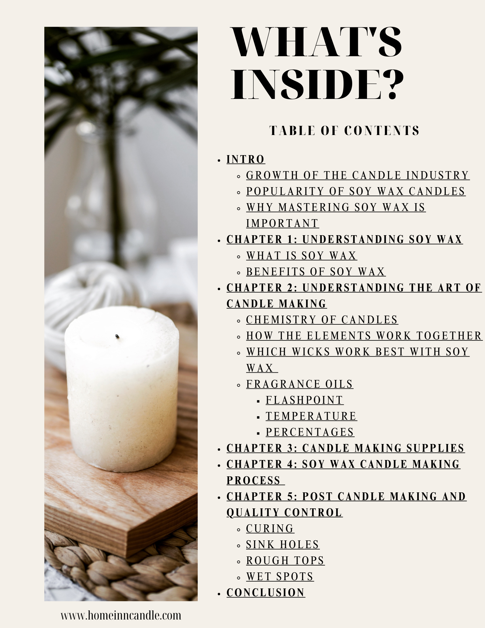 In this ebook I am giving you my SECRETS to how I mastered soy wax candles. I will give you a little review of the history behind soy wax, help you better understand the chemistry of candles, provide you with a list of candle supplies and suppliers, review the candle making process, and detail quality control post candle making.