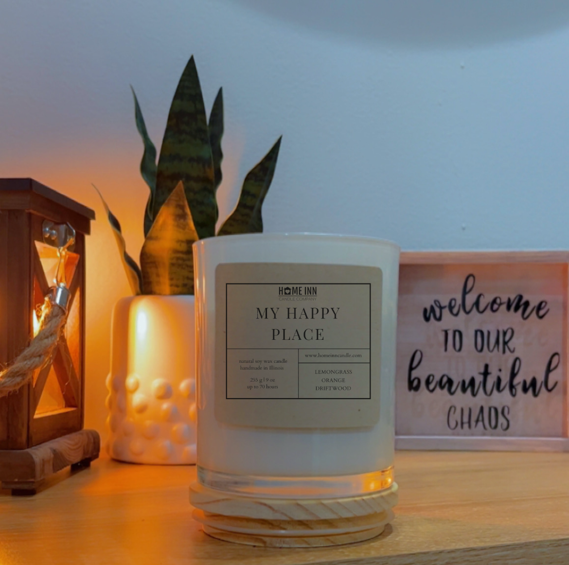 Transport yourself to your personal sanctuary with the My Happy Place Candle from Home Inn Candle Company. Designed to spark joy and lift your spirits, this vibrant fragrance opens with the bright, cheerful aroma of freshly squeezed oranges, filling your home with bursts of sunshine and positivity. Soft notes of invigorating lemongrass weave through the air, energizing your space and awakening your senses, while the grounding scent of warm driftwood wraps you in a comforting, serene embrace.
